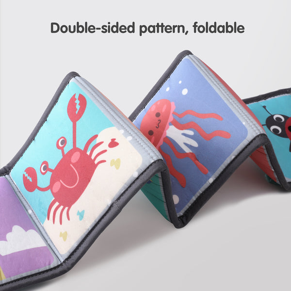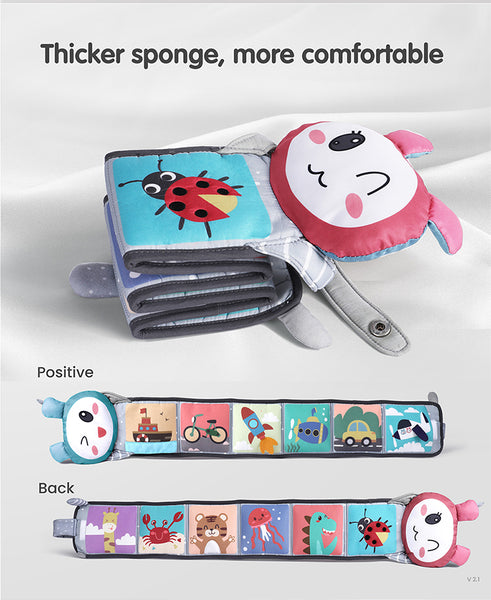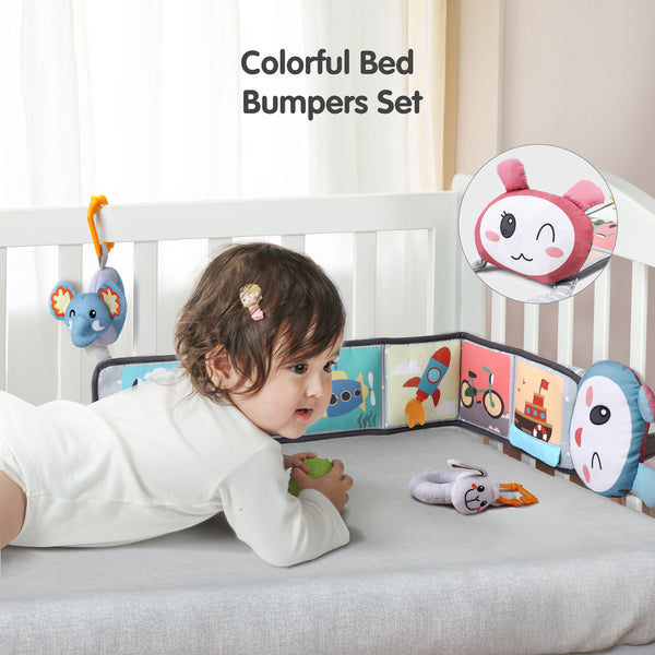 -Includes 4 hanging toys and a double sided Soft Cloth Book (which can also be used as a bumper)