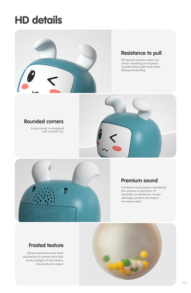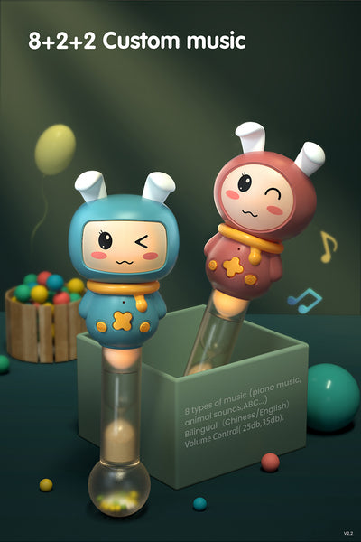 - (Baby Learning Toy) Shake to hear the colorful beads rattle and music, rabbit cheeks light up, introduces the concept of cause and effect. Baby music rattle has 11 modes, default, instrument, animal voice, letters and numbers, greeting, family, ring and SMS voice, song, story, sleep mode 1 and sleep mode 2. Babies have fun and encourage them to learn more things, inspirate baby's passion for music.