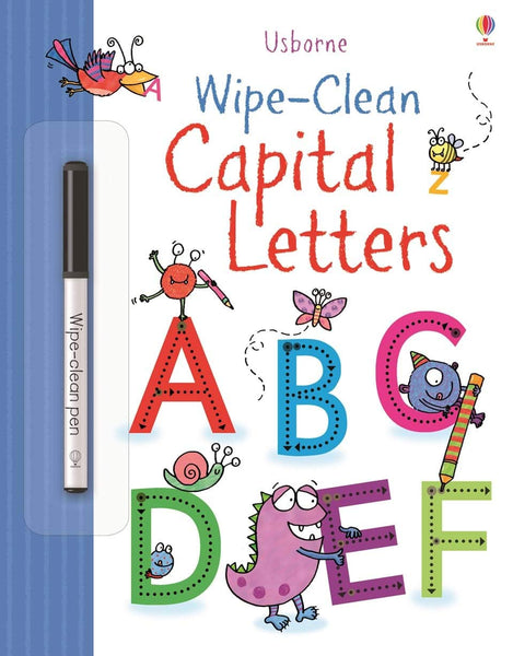 Usborne Wipe and Clean Capital Letters A wipe-clean book full of friendly monsters to help children learn to write capital letters. Pen-control activities such as tracing the wings of a butterfly or drawing waves for monsters to surf on help children practise the shape of each letter, and the special wipe-clean pen means activities can be done again and again. |